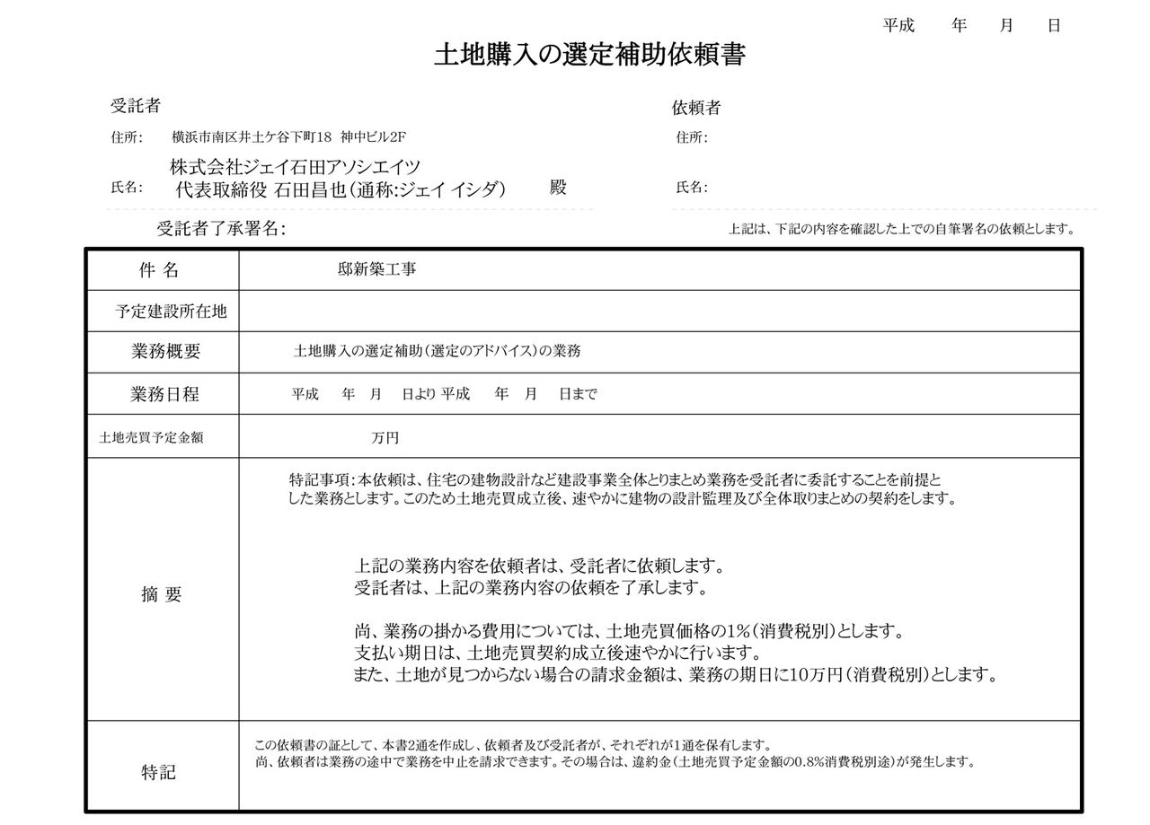 まず、下部添付の土地購入補助の依頼書の提出を先にお願いしております。この時に着手金10万円(消費税別)をお支払いただきます。